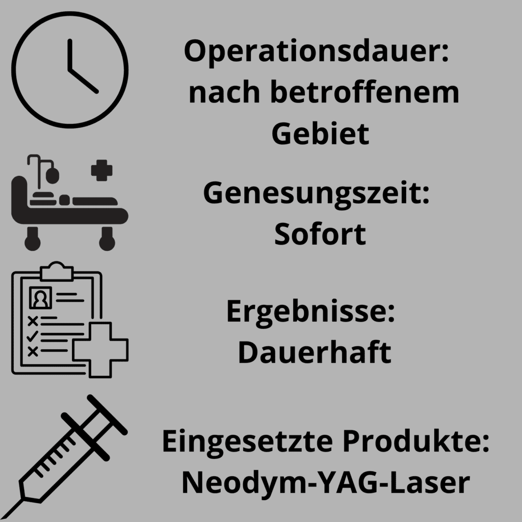Behandlung von Krampfadern und Rosacea Wie funktioniert die Behandlung? Couperose ist eine vaskuläre Hautveränderung, bei der es zu einer Vermehrung feiner Blutgefäße in der Haut kommt. Diese erweiterten Mikrogefäße verursachen eine sichtbare Rötung, die sich bei Wärme, körperlicher Anstrengung, Stress oder emotionalen Belastungen verstärken kann. Besonders häufig tritt Couperose im Bereich der Wangen, des Kinns, des Dekolletés oder rund um die Nase auf. Dank moderner ästhetischer Medizin lässt sich Couperose heute sehr effektiv behandeln. Besonders bewährt haben sich IPL-Behandlungen zur Hautverjüngung sowie der vaskuläre Neodym-YAG-Laser, der gezielt auf die betroffenen Blutgefäße wirkt. In der Regel sind mehrere Sitzungen notwendig, um die Rötungen sichtbar zu reduzieren. Die Ergebnisse sind nachhaltig, dennoch empfehlen wir gelegentliche Auffrischungssitzungen, um das Hautbild langfristig zu stabilisieren. Behandlung von Varizen und Gefäßveränderungen Varizen oder sogenannte Äderchen sind Erweiterungen kleiner Venen, die häufig an den Beinen, aber auch im Gesicht auftreten können. Gefäße mit einem kleinen bis mittleren Durchmesser (bis ca. 2 mm) lassen sich sehr gut mit dem Neodym-YAG-Laser behandeln. Je nach Ausprägung sind mehrere Sitzungen erforderlich. In manchen Fällen wird die Lasertherapie sinnvoll mit einer Sklerosierung kombiniert, bei der spezielle Substanzen in die Vene eingebracht werden. Auch bei Besenreisern und Angiomen zeigt der Neodym-YAG-Laser hervorragende Ergebnisse. Durch die gezielte Wirkung auf das Hämoglobin wird das Gefäß verschlossen und vom Körper nach und nach abgebaut. Wie führen wir die Behandlung durch? Die Behandlung erfolgt ambulant in unserer Praxis und erfordert keinen Krankenhausaufenthalt. Vor der Sitzung tragen wir eine betäubende Creme auf, um mögliche Beschwerden so gering wie möglich zu halten. Nach der Behandlung wird eine regenerierende Creme empfohlen, bis sich die Haut vollständig erholt hat. Da es sich um eine oberflächliche Laserbehandlung mit modernster Technologie handelt, entstehen keine Narben. Die Anzahl der Sitzungen hängt von Größe, Tiefe und Ausprägung der Hautveränderung ab. Nach der Behandlung kann sich eine kleine Kruste bilden, die in der Regel innerhalb von 5 bis 10 Tagen von selbst abfällt. Wie verläuft die Erholungsphase nach einer Krampfader-Laserbehandlung? Die Rückkehr in den Alltag ist nach einer vaskulären Laserbehandlung in der Regel sofort möglich. Direkt nach der Sitzung können Sie Ihre gewohnten Aktivitäten wieder aufnehmen. Es wird jedoch empfohlen, intensive körperliche Anstrengung und Sport in den ersten 24 Stunden nach der Behandlung zu vermeiden, um die optimale Heilung zu unterstützen. Mögliche Nebenwirkungen nach der Behandlung In manchen Fällen kann es im behandelten Bereich zu leichten Blutergüssen kommen. Diese sind harmlos und verschwinden normalerweise innerhalb der ersten Woche nach der Behandlung von selbst. Besonders bei der Behandlung von Krampfadern mit größerem Durchmesser kann zudem eine bräunlich-braune Pigmentierung entlang der behandelten Vene auftreten. Diese vorübergehende Verfärbung ist Teil des natürlichen Heilungsprozesses und kann mehrere Wochen sichtbar bleiben. In der Regel bildet sie sich jedoch innerhalb von zwei bis sechs Wochen vollständig zurück, ohne bleibende Spuren zu hinterlassen. Wann sind die endgültigen Ergebnisse sichtbar? Das endgültige Ergebnis der Laserbehandlung zeigt sich nach etwa ein bis zwei Monaten, sobald der Körper die behandelten Gefäße vollständig abgebaut hat. Schon früh berichten unsere Patientinnen von einem deutlich verbesserten Hautbild. Zufriedenheit und ästhetisches Ergebnis Trotz der kurzen Erholungsphase und der schrittweisen Resultate ist die Zufriedenheit unserer Patientinnen sehr hoch. Besonders geschätzt werden die Schonung des Gewebes, der hohe Komfort der Behandlung und das neue, ästhetische Erscheinungsbild ohne unschöne blaue, rote oder violette Venen. Behandlungen im Zusammenhang mit der Behandlung von Krampfadern und Rosacea IPL-Impulslicht-Photorejuvenation Entfernung von Laserflecken Entfernung von Tätowierungen per Laser Neueste Blogeinträge Mesotherapie Haare Erfahrungsberichte Kombinierte Haarbehandlungen: Haartransplantation + PRP + Mesotherapie – Wann anwenden? Entfernung von Besenreisern an den Beinen: Gefäßlaser vs. Mikroschaum-Sklerotherapie Verschönern Sie Ihr Gesicht und Ihren Körper mit nicht-chirurgischen ästhetischen Behandlungen. Bruststraffung Vergleich – umfassender Leitfaden zur Entscheidung für Ihre Brustästhetik 7 Behandlungen zur Verjüngung von Hals und Dekolleté Andere Behandlungen IPL-Impulslicht-Photorejuvenation Fleckenentfernung Entfernung von Tätowierungen per Laser Laser-Körperhaarentfernung CO2-Laser-Gesichtsregalung ästhetischebehandlungen Behandlung von Krampfadern und Rosacea